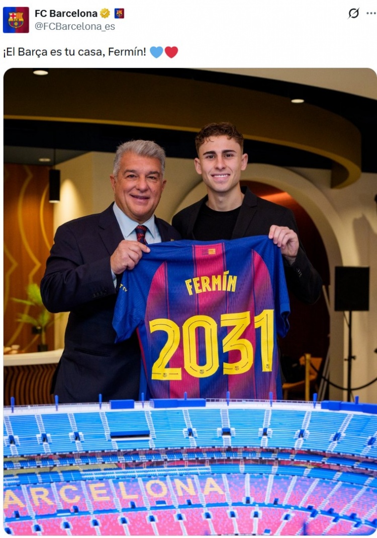 巴萨官推配文写道:“巴萨就是你的家,费尔明!”此前巴萨已经官方宣布与费尔明达成续约,有报道称其新合同薪资有明显上涨。